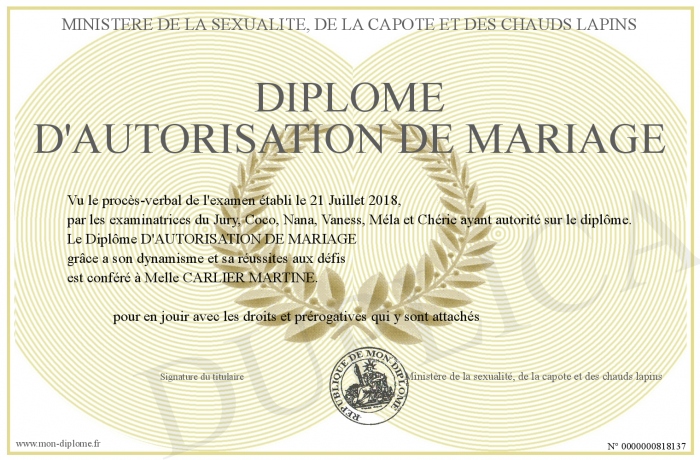 Envoyez par email votre Diplôme D'AUTORISATION DE MARIAGE personalisé