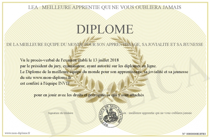 Envoyez par email votre Diplôme de la meilleure équipe du monde pour son apprentissage, sa jovialité et sa jeunesse personalisé