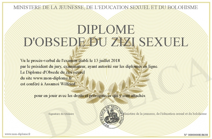 Envoyez par email votre Diplôme d'Obsede du zizi sexuel personalisé