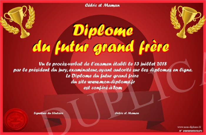 Envoyez par email votre Diplôme du futur grand frère personalisé