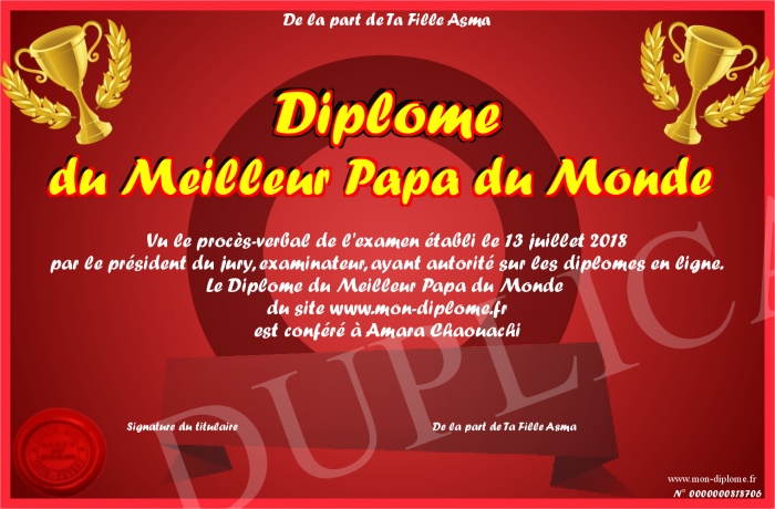 Envoyez par email votre Diplôme du Meilleur Papa du Monde personalisé