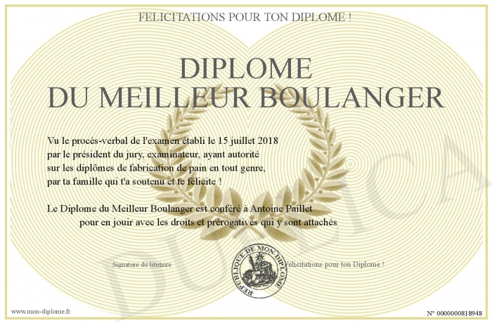 Envoyez par email votre Diplôme du Meilleur Boulanger personalisé