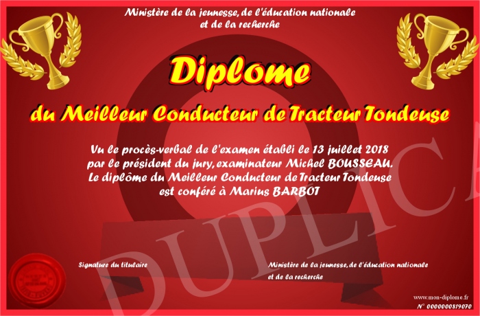 Envoyez par email votre Diplôme du Meilleur Conducteur de Tracteur Tondeuse personalisé