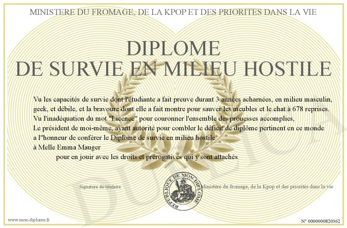 Envoyez par email votre Diplôme de survie en milieu hostile personalisé