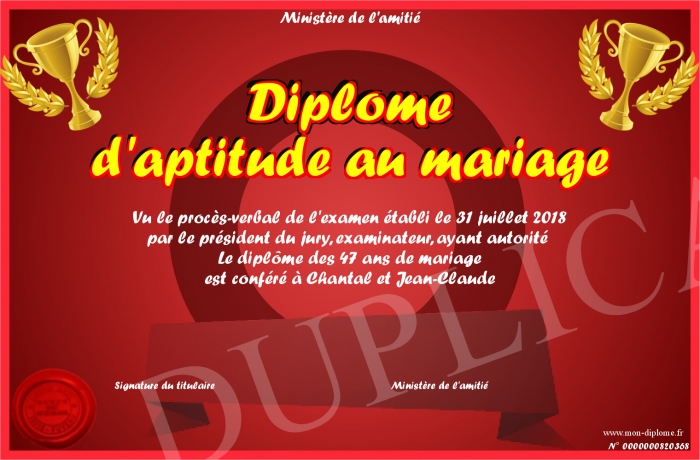 Envoyez par email votre Diplome d'aptitude au mariage personalisé
