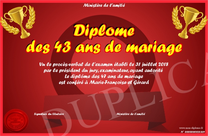 Envoyez par email votre Diplome des 43 ans de mariage personalisé