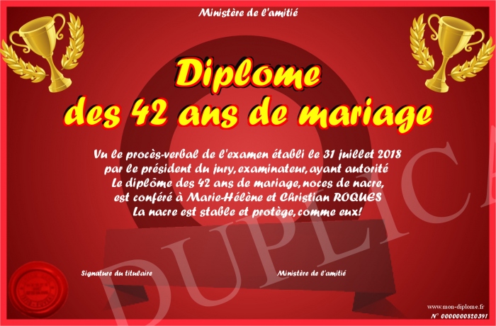 Envoyez par email votre Diplôme des 42 ans de mariage personalisé
