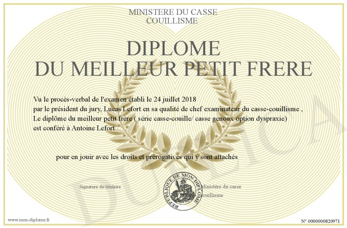 Envoyez par email votre Diplôme du meilleur petit frère personalisé