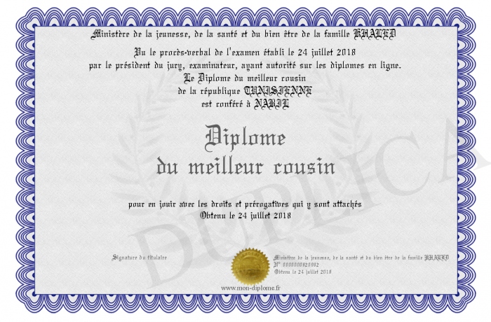 Envoyez par email votre Diplôme du meilleur cousin personalisé