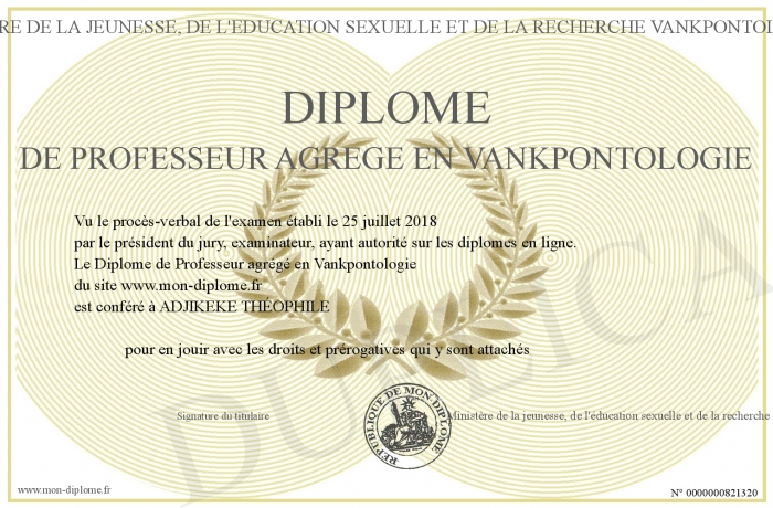Envoyez par email votre Diplôme de Professeur agrégé en Vankpontologie personalisé