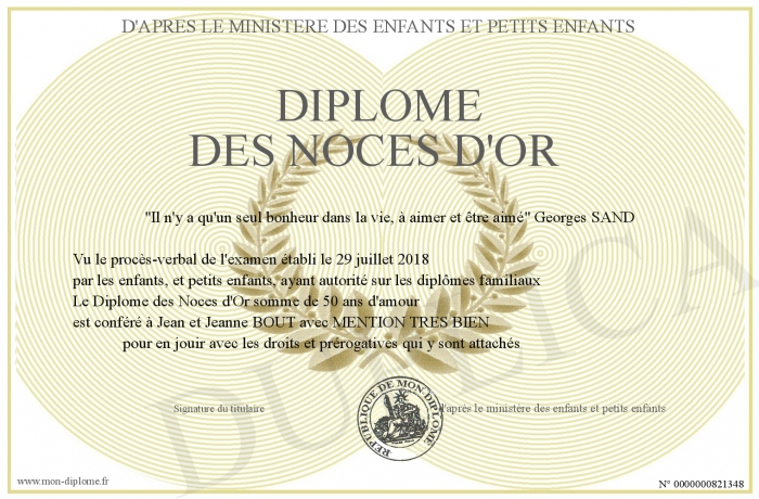Envoyez par email votre Diplôme des Noces d'Or personalisé