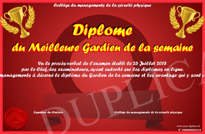 Envoyez par email votre Diplôme du Meilleure Gardien de la semaine personalisé