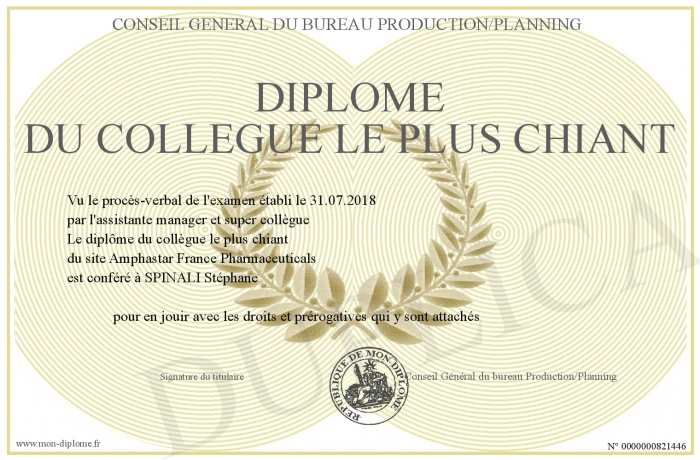 Envoyez par email votre Diplôme du collègue le plus chiant personalisé