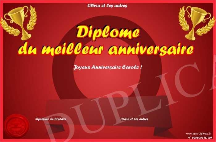 Envoyez par email votre Diplome du meilleur anniversaire personalisé