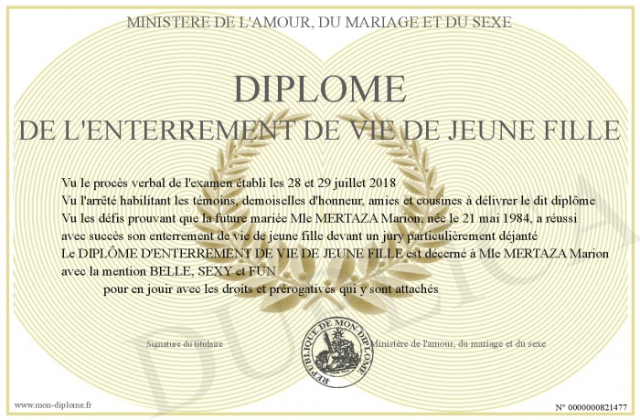 Envoyez par email votre Diplôme de l'enterrement de vie de jeune fille personalisé