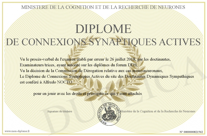 Envoyez par email votre Diplôme de Connexions Synaptiques Actives personalisé