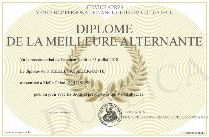 Envoyez par email votre Diplôme de la MEILLEURE ALTERNANTE personalisé