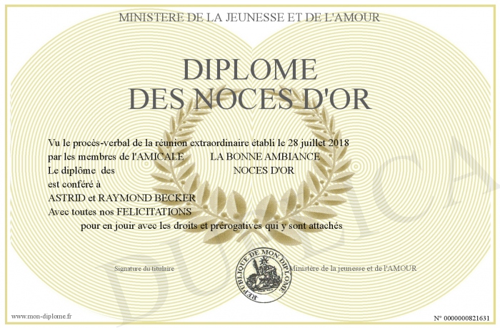 Envoyez par email votre Diplôme DES NOCES D'OR personalisé