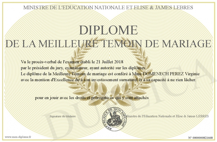 Envoyez par email votre Diplôme de la meilleure témoin de mariage personalisé