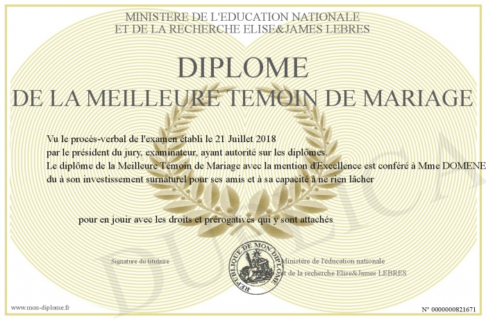 Envoyez par email votre Diplôme de la Meilleure Témoin de Mariage personalisé