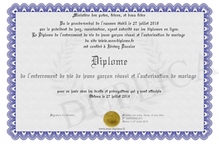 Envoyez par email votre Diplôme de l'enterrement de vie de jeune garçon réussi et l'autorisation de mariage personalisé