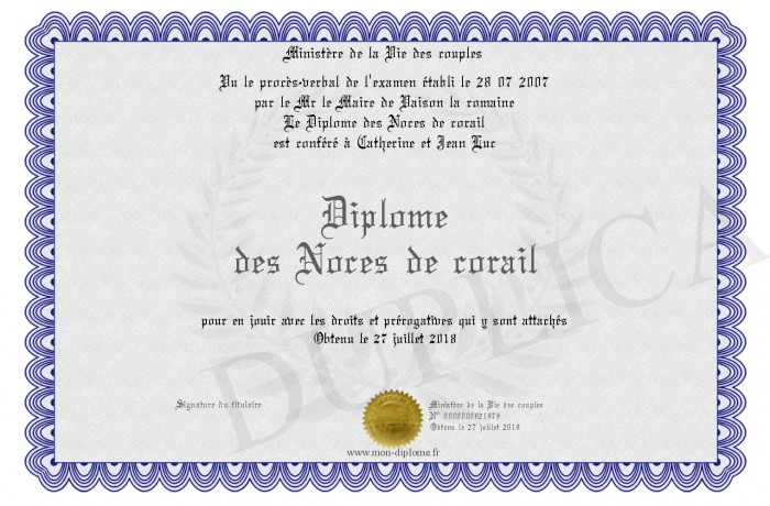 Envoyez par email votre Diplôme des Noces de corail personalisé