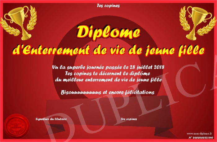 Envoyez par email votre Diplome d'Enterrement de vie de jeune fille personalisé