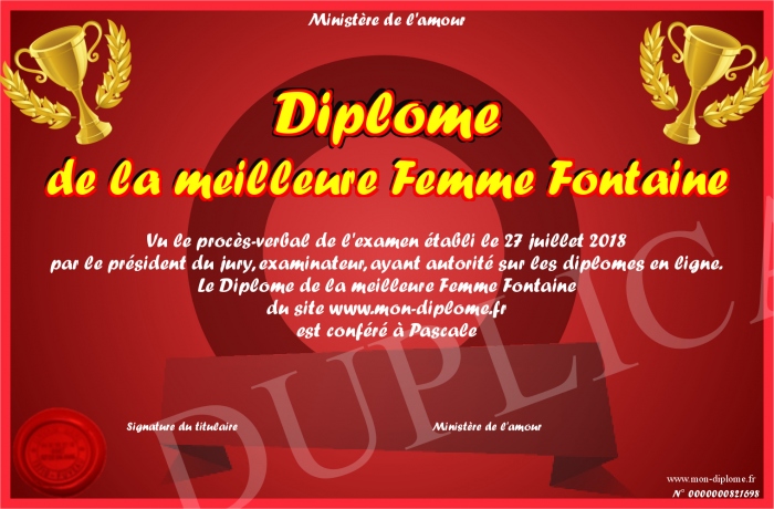 Envoyez par email votre Diplome de la meilleure Femme Fontaine personalisé