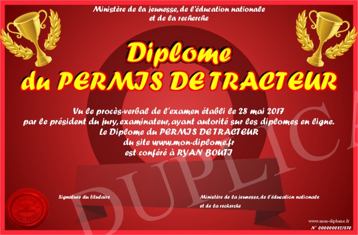 Envoyez par email votre Diplôme du PERMIS DE TRACTEUR personalisé
