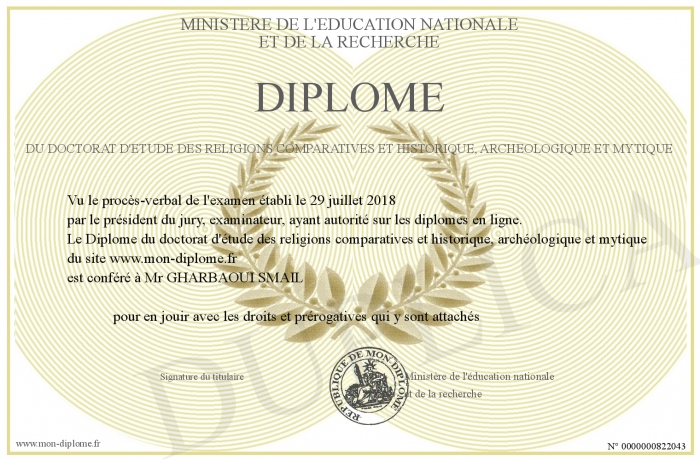 Envoyez par email votre Diplôme du doctorat d'étude des religions comparatives et historique, archéologique et mytique personalisé