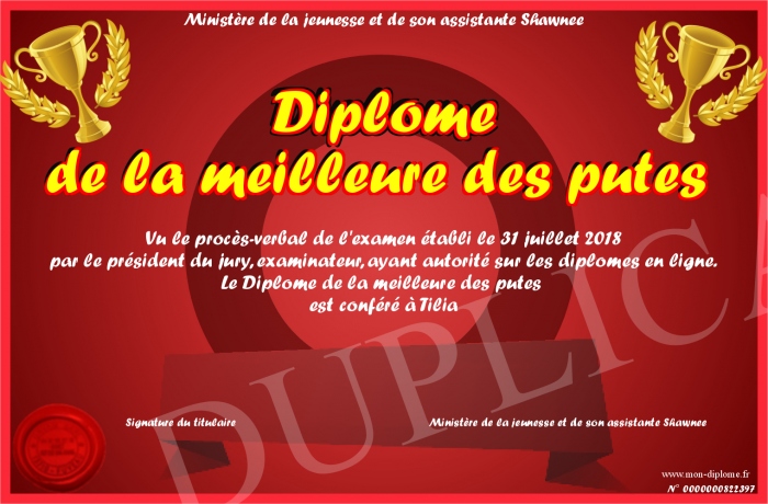 Envoyez par email votre Diplôme de la meilleure des putes personalisé