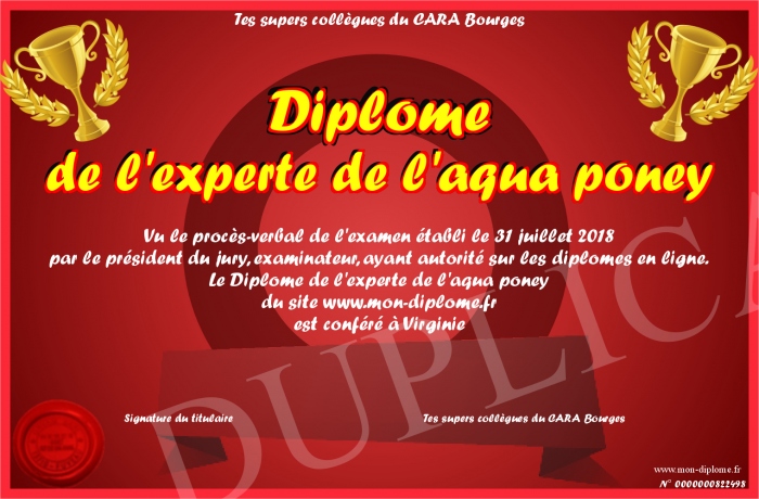 Envoyez par email votre Diplôme de l'experte de l'aqua poney personalisé
