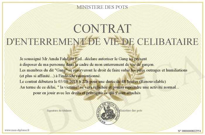 Envoyez par email votre Contrat d'enterrement de vie de célibataire personalisé