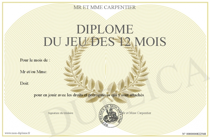 Envoyez par email votre DIPLOME DU JEU DES 12 MOIS personalisé