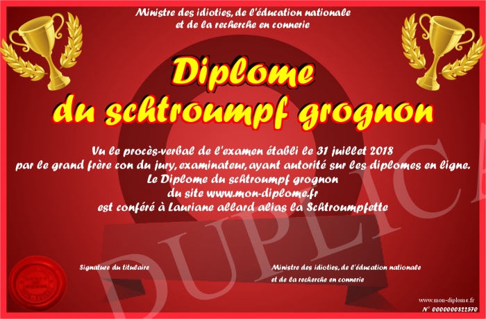Envoyez par email votre Diplôme du schtroumpf grognon personalisé