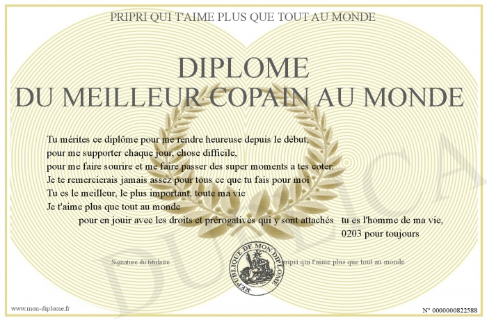 Envoyez par email votre Diplôme du meilleur copain au monde personalisé