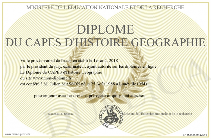 Envoyez par email votre Diplôme du CAPES d'Histoire Géographie personalisé
