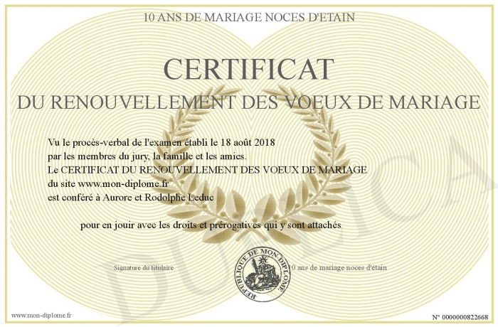 Envoyez par email votre CERTIFICAT DU RENOUVELLEMENT DES VOEUX DE MARIAGE personalisé