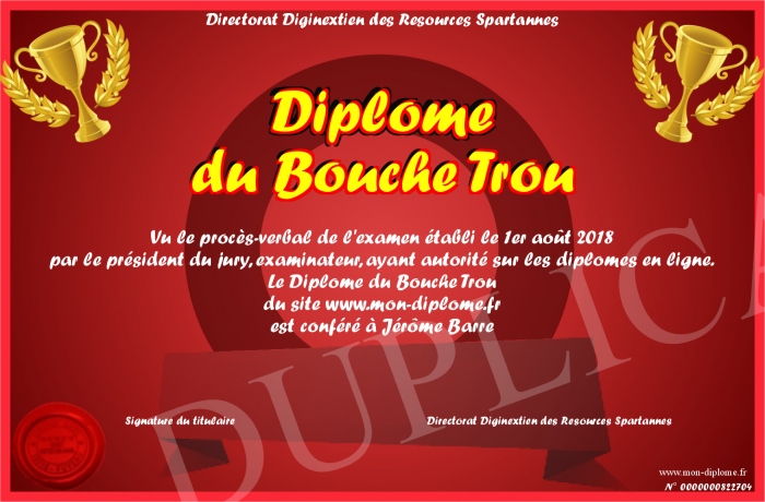 Envoyez par email votre Diplôme du Bouche Trou personalisé