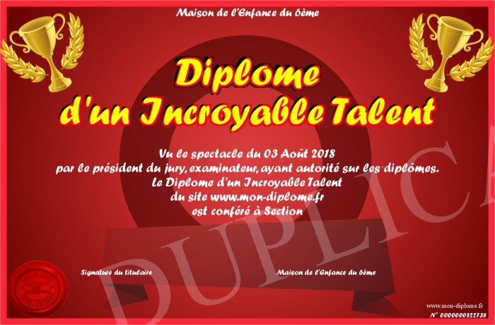Envoyez par email votre Diplôme d'un Incroyable Talent personalisé