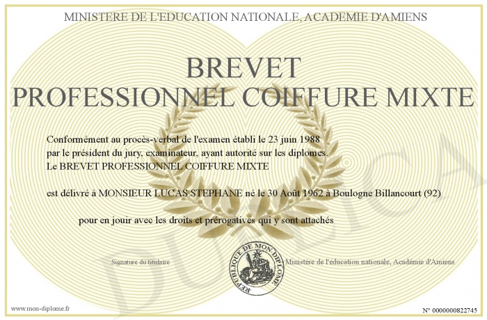 Envoyez par email votre BREVET PROFESSIONNEL COIFFURE MIXTE personalisé