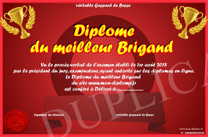 Envoyez par email votre Diplôme du meilleur Brigand personalisé