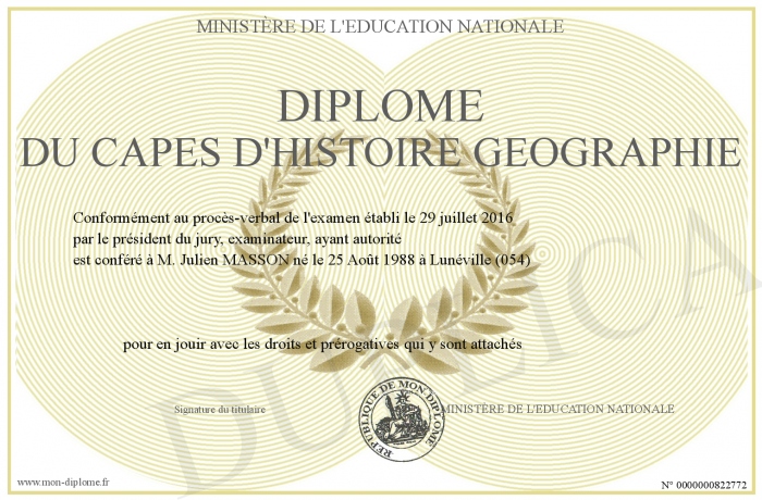 Envoyez par email votre Diplôme du CAPES d'Histoire Géographie personalisé