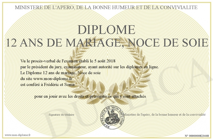 Envoyez par email votre Diplôme 12 ans de mariage, Noce de soie personalisé