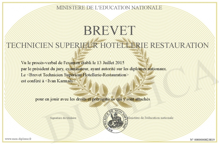 Envoyez par email votre Brevet Technicien Supérieur Hotellerie Restauration personalisé