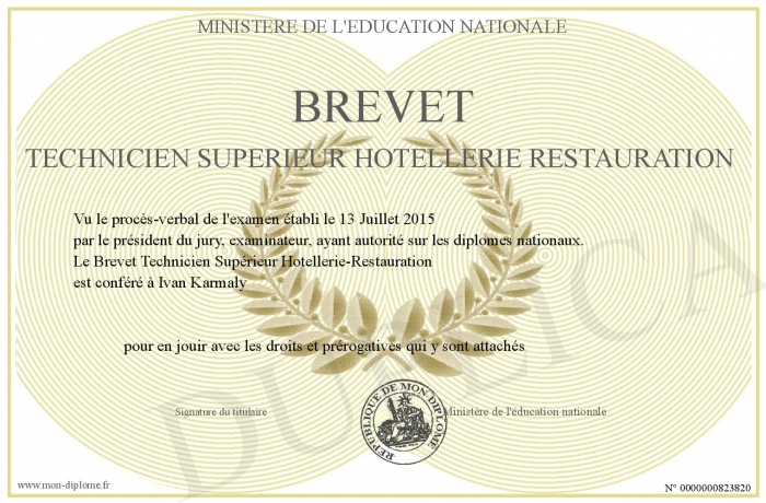 Envoyez par email votre BREVET Technicien Supérieur Hotellerie Restauration personalisé