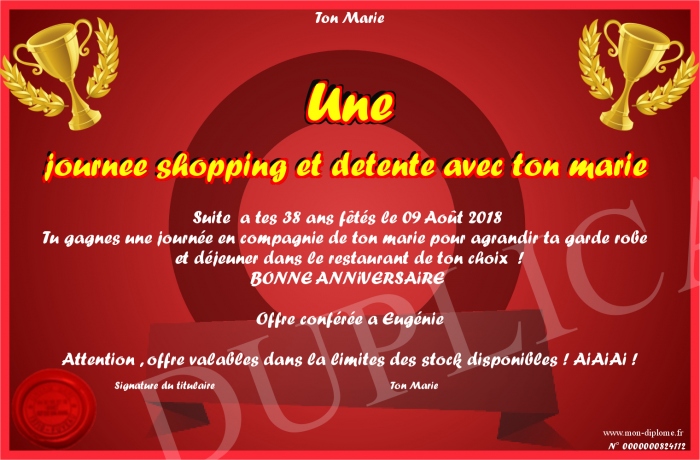 Envoyez par email votre Une journee shopping et detente avec ton marie personalisé