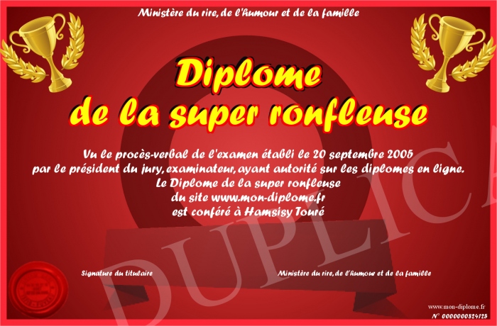 Envoyez par email votre Diplôme de la super ronfleuse personalisé