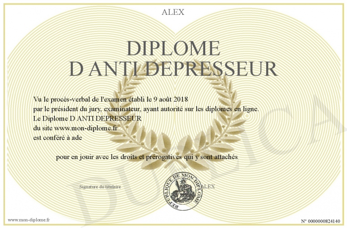Envoyez par email votre Diplome D ANTI DEPRESSEUR personalisé