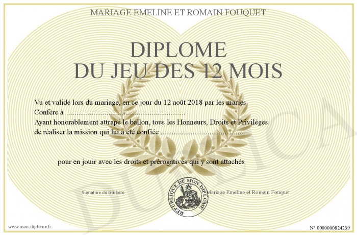 Envoyez par email votre Diplôme du jeu des 12 mois personalisé